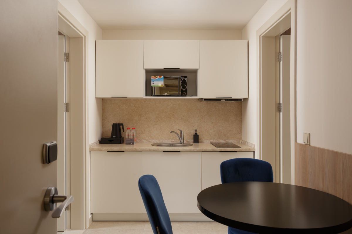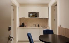 Просторные апартаменты джуниор станут идеальным выбором для продолжительного отдыха большой семьи или компании. Апартаменты состоят из спальни с большой двуспальной кроватью, спальни с двумя односпальными кроватями и кухни.