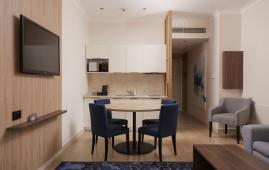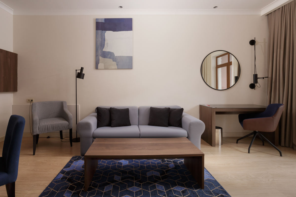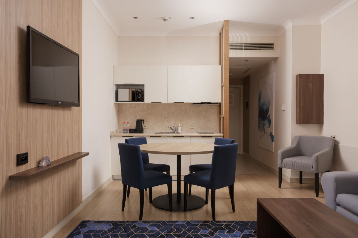 Светлый и просторный семейный двухкомнатный апартамент с одной спальней, отдельной гостиной с мягкой мебелью, оборудованной кухней и полноценной обеденной зоной.