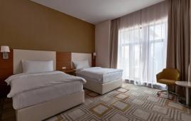 Уютный номер с двумя односпальными кроватями, рабочая зона, косметические принадлежности, чайная станция и собственная кофемашина – всё, что нужно для прекрасного отдыха в горах.