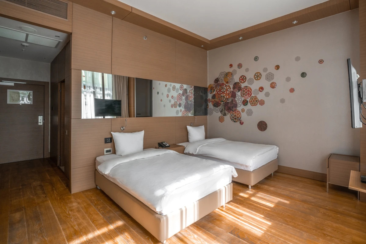 Номер для комфортного отдыха с двумя односпальными кроватями, рабочей зоной и мягкой софой, а также чайная станция, халат, тапочки и косметические принадлежности. Номера этой категории оснащены ванной и душевой кабиной, либо только душевой кабиной. Вид из номера открывается на внутренний двор.