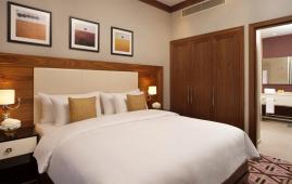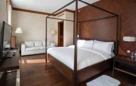 Великолепный двухуровневый люкс, идеально подходящий для семейного отдыха на горном курорте. На первом этаже расположены гостиная с декоративным камином, столовая на 4 персоны, балкон и гостевой туалет, на втором этаже – две спальни (в главной спальне установлена большая двуспальная кровать, во второй спальне – две односпальные), 2 гостиные комнаты, гардеробная, джакузи с шезлонгами на открытой террасе. В номере находится капсульная кофемашина.