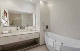 Комфортный двухкомнатный люкс с балконом. Окна номера выходят во внутренний дворик отеля. Этот просторный номер состоит из спальни, гостиной с мягкой зоной и декоративным камином, отдельной гардеробной комнаты, двух туалетных комнат – личной и гостевой. В просторной ванной комнате установлены ванна и тропический душ. К услугам гостей – капсульная кофемашина.