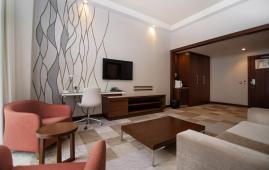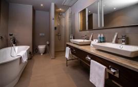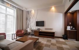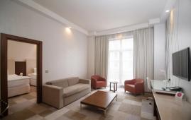Просторный люкс для большой семьи. В распоряжении гостей спальня с двумя односпальными кроватями и гостиная с мягкой зоной для отдыха. В гостиной возможно организовать дополнительное спальное место или уединиться для просмотра фильма.