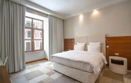 Удобный однокомнатный номер с двуспальной кроватью, предусматривает всё необходимое для маломобильных гостей: расширенные проёмы в ванной комнате, специальные поручни и прикроватная кнопка вызова персонала.