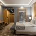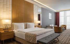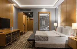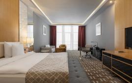Стильный и комфортный номер с увеличенной площадью. Пространство номера поделено на рабочую зону и мягкую для отдыха. Панорамное окно придаёт особый шарм интерьеру, а с просторного балкона можно наслаждаться великолепным видом на горные вершины.
