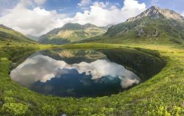 Экотропа проходит по альпийским лугам долины Цирка-3 мимо высокогорных озёр – верхнее Айсберг и нижнее Холодное, образовавшихся в результате сходов лавин с крутых склонов отрогов Чёрной Пирамиды и Аибги 3 (Седая). Снежные массы своей огромной ударной силой выбили ямы, а тающие снега наполняют их водой. Ручей Ржаной, набирающий свою максимальную силу на скальных сбросах водопада Поликаря, подпитывается, в том числе, и из этих озёр. В засушливые и жаркие сезоны к осени озёра могут пересыхать и при этом до июля они, как правило, скрыты под снегом.